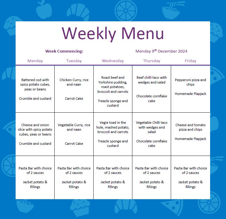 Here is the lunch menu for W/C 9th December 2024π½π§π₯ͺππ©π