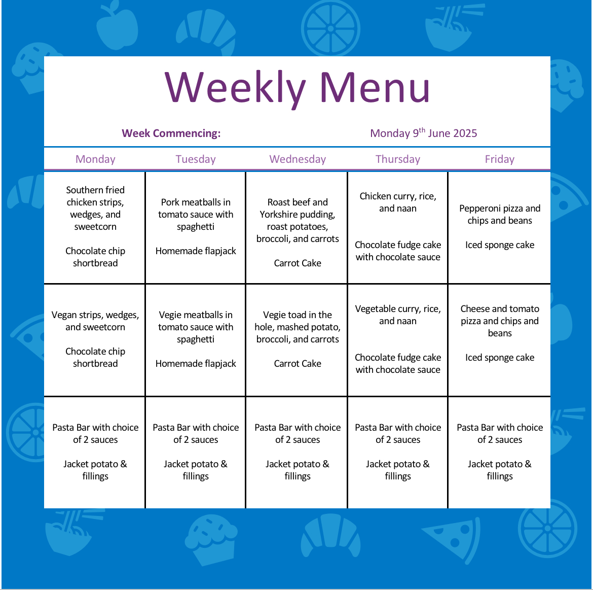 Lots of yummy food including π chicken, π meatballs, π₯ curry and π pizza, plus lots more!