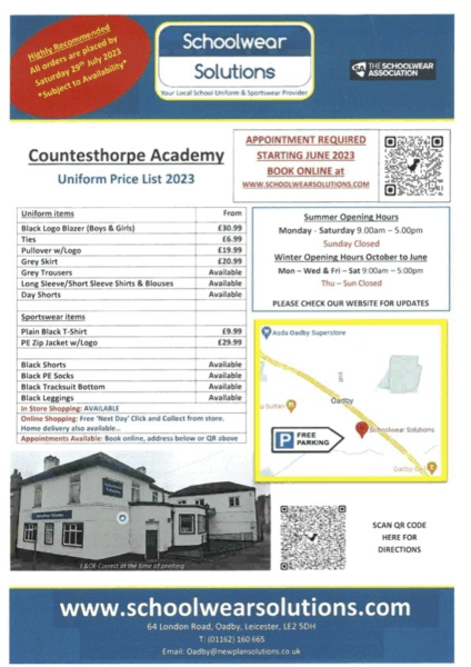 Tie | Countesthorpe Academy Tie (traditional or clip on) | Yes or from our online CA shop | Compulsory for all students in Years 7 to 11 | All year round |